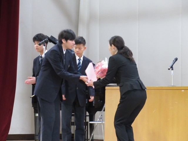 本日離任式を行い、離任される2名の教職員の方へ、感謝の言葉と花束を贈りました。