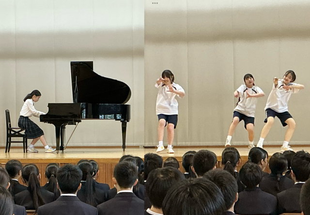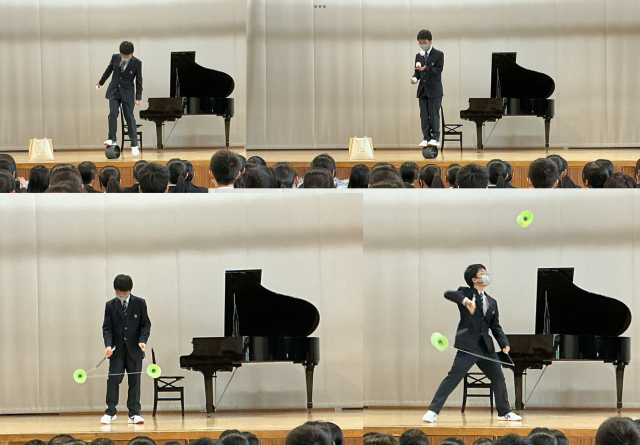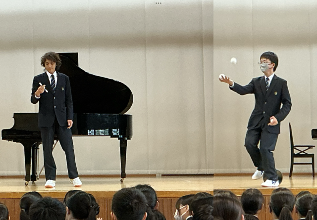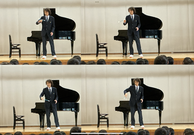 音楽のリズムに乗ってペン回し。ジャグリング。美しいピアノ演奏ショパンの調べ。個性的なトリオのダンス。