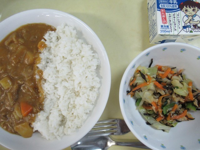 4月13日の給食 公開日 2026/04/13 更新日 2026/04/13 給食 ・ カレーライス ・ ツナとひじきのサラダ・ 牛乳 今年度、はじめてのカレーライスです。おいしさの秘密は、 玉ねぎをよく炒めて甘みをだして、じっくり煮込むことです。