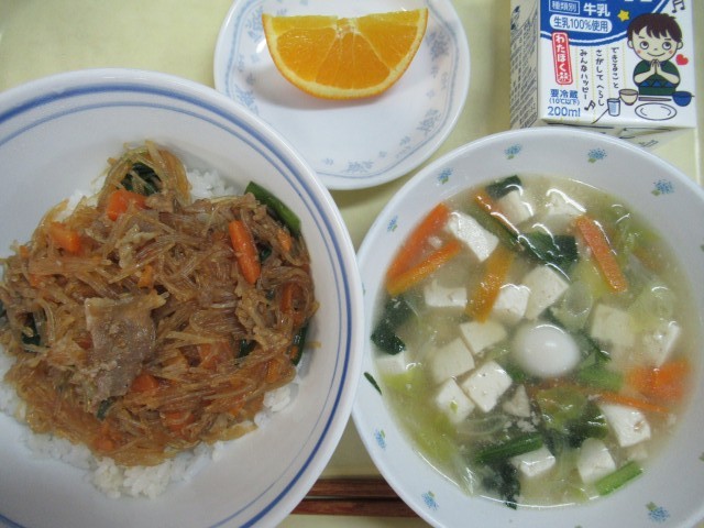 4月20日の給食 公開日 2026/04/20 更新日 2026/04/20 給食 ・ チェプチェ丼 ・ うずらの卵と豆腐のスープ・ ネーブルオレンジ ・ 牛乳 チャプチェは、春雨や野菜や肉を炒めた韓国の料理です。 目黒区はソウル特別市中浪区と友好都市となっています。