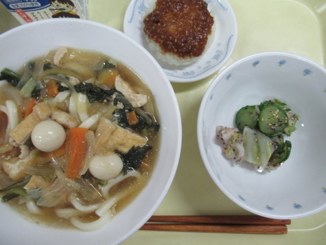 ・ こぎつねうどん ・ ごへいもち・ 野菜のゆかり和え ・ 牛乳 鶏肉(宮崎) 玉ねぎ(北海道) にんじん(北海道) 長ねぎ(埼玉) 小松菜(埼玉) キャベツ(茨城) きゅうり(秋田)