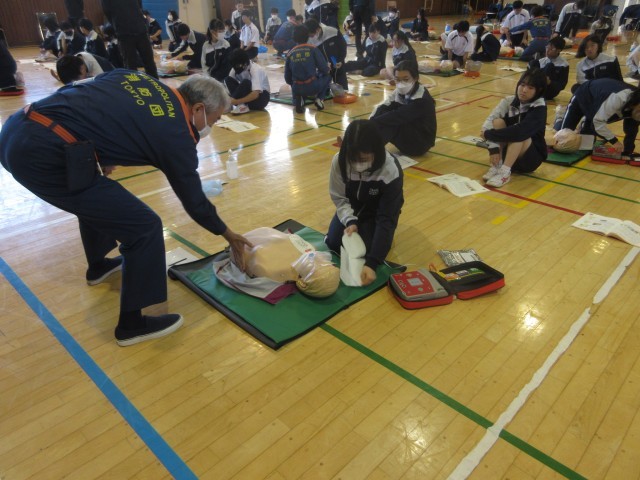 3年生は、安全指導の一環で普通救命救急講習を行いました。   目黒区では、全ての区立小・中学校及び多くの区立施設にAED(自動体外式除細動器)を...