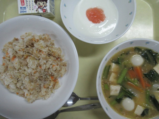 ・五目チャーハン ・ごまみそタンタンスープ・ヨーグルト紅玉ソース ・牛乳 にんにく(青森) しょうが(高知) にんじん(青森) ねぎ(山形) 小松菜(茨城) 白菜(茨城) レモン(高知) 豚肉(秋田)...