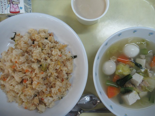 ・ キムチとにらのチャーハン ・ 冬野菜とうずらの卵のスープ・ きなこプリン ・ 牛乳 鶏肉(岩手) 豚肉(秋田) しょうが(高知) にんじん(千葉) 長ねぎ(埼玉) にら(茨城) 大根(神奈川) 白...