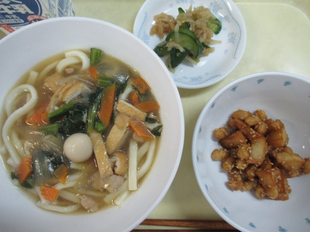 ・ 煮込みうどん ・ 切干大根のハリハリ漬け・ 大豆入りみそポテト ・ 牛乳 鶏肉(宮崎) 玉ねぎ(北海道) にんじん(千葉) 長ねぎ(埼玉) じゃがいも(北海道) 小松菜(埼玉) きゅうり(埼玉) ...